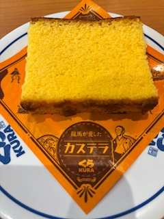久々カステラ食べた、ぱくっと ふわふわ系好きな方はくら寿司で出てたカステラあんまりかも、、?? でも味は最高👍✨ 今日おやすみ ゆら